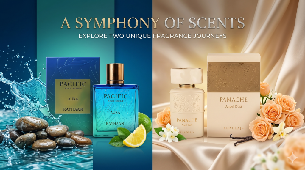 Khadlaj Panache Angel Dust by Khadlaj is a fragrance I recently tried, and it feels like wrapping yourself in a soft, sweet cloud.The opening is light and airy clean, gentle, and instantly comforting without being too strong.As it settles, a delicate blend of florals and subtle sweetness comes through, giving it a cozy elegance.In the dry down, it leaves a smooth musky trail that lingers softly and feels effortlessly beautiful. Rayhaan Pacific Aura is one of those releases that starts getting talked about everywhere all at once, and usually when that happens, I get a little skeptical. A lot of